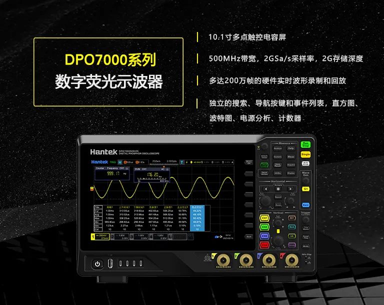 2023年4月,青岛汉泰发布新一代四通道数字荧光示波器DPO7000系列。采用10.1寸多点触控高清显示屏,256级波形灰度及色温显示,500MHz带宽,2GSa/s采样率,2G存储深度,500.000wfms/s波形捕获率;25MHz信号发生器,支持任意波输出;41种自动测量,测量结果支持统计和分析;丰富的串行协议触发和解码功能;集7种仪器功能于一体,可帮助工程师显著简化测量系统实现快速测量;丰富的配置接口,使用更方便;是一款值得信赖,能够为您提供专业测量的示波器。