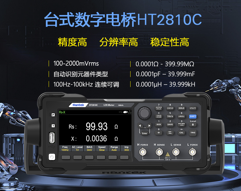 2026 年 1月 10日,青岛汉泰全新一代台式数字电桥HT2810C 正式发布!HT2810C可以自动识别元器件类型;测试频率100Hz-100kHz 连续可调;测试电平 (100-2000)mVrms连续可调;内部DC偏置电压 (0-1500)mV连续可调;支持直流电阻、电解电容测量;基本准确度 0.1%; 支持开路、短路校准;数据保持和数据记录功能;标配:USB HOST、USB DEVICE、LAN、RS232/485、Handler; 支持SCPI通讯协议;Handler 接口,支持比较器分选。