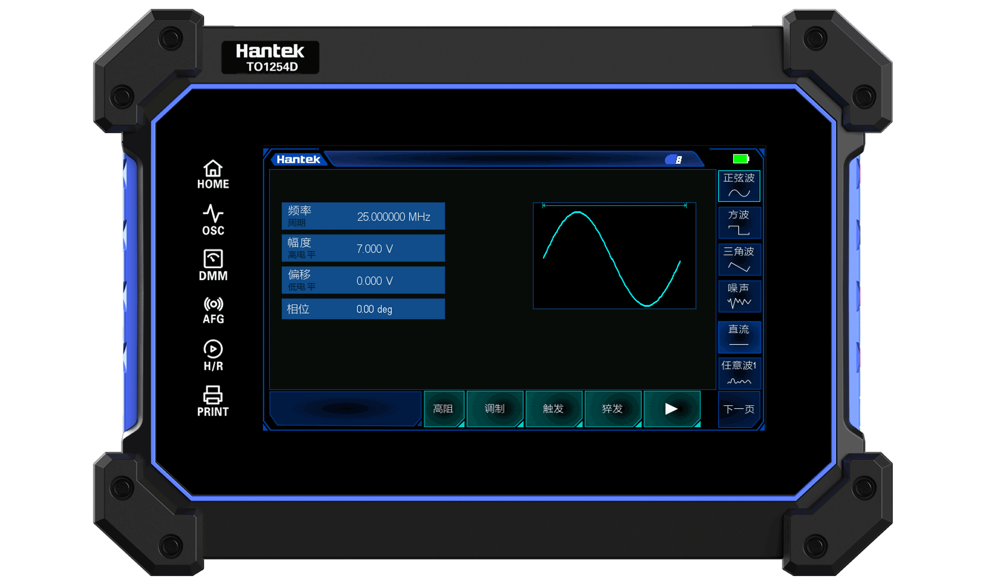 示波器/万用表/信号源/数据记录仪 18W快充输入,超长待机时间 7寸800*480多点全触控电容触摸屏 8M存储深度,一键截屏保持波形 |