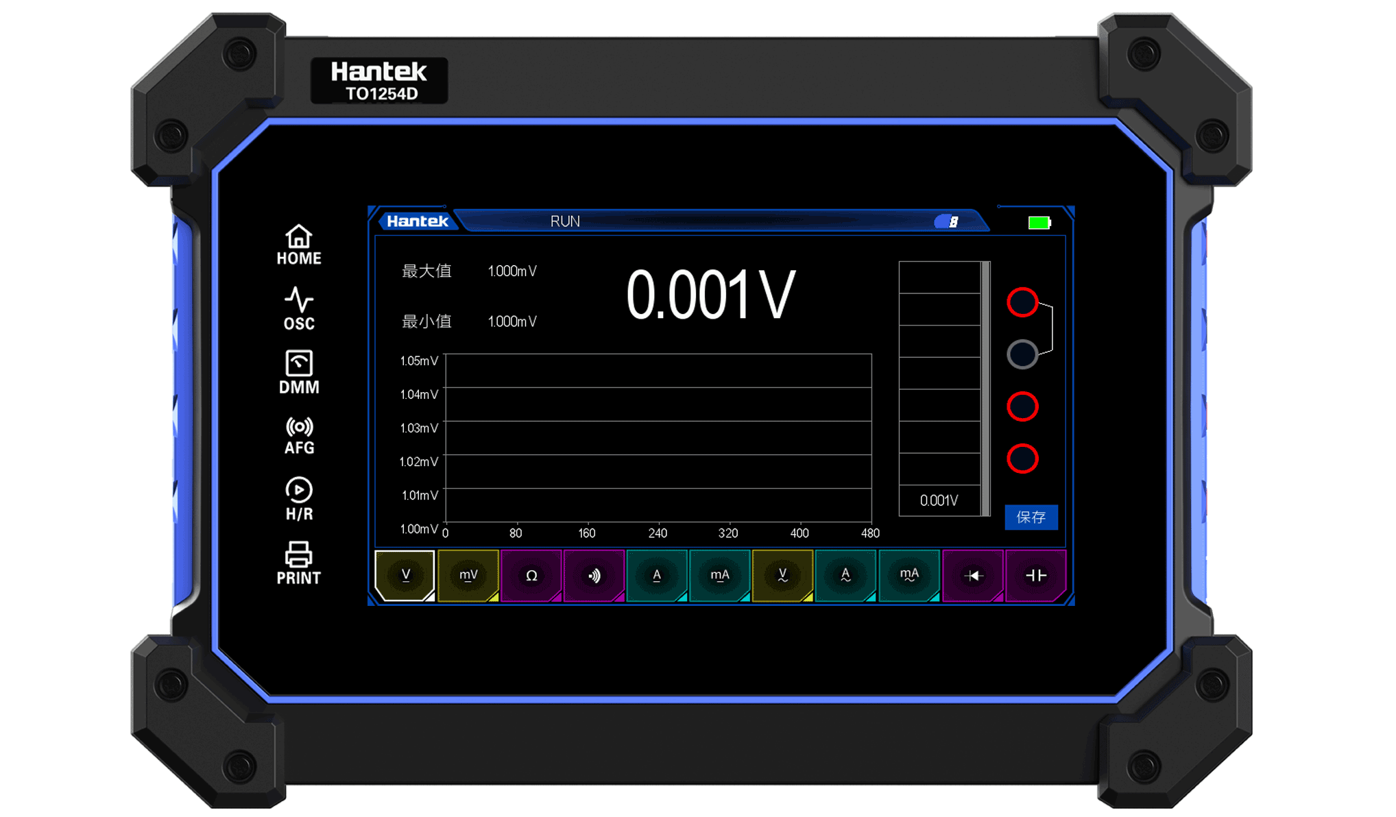 1GSa/s | 示波器/万用表/信号源/频率 计数器/频谱分析/数据记录仪 IP-51防水防尘防摔; 防盗锁/Flash照明灯/ 三脚架固定座/可更换电池/2M存储 |