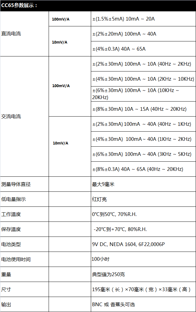 可配合示波器看电流波形,可配合万用表看电流数据。由坡莫合金 和霍尔元件组成的电流传感器,将直流或交流电流线性地转换为直流或交流电压,可以通过BNC接头接到示波器上,观察电流波形;也可以通过香蕉接头接到万用表上,得到电流数据。