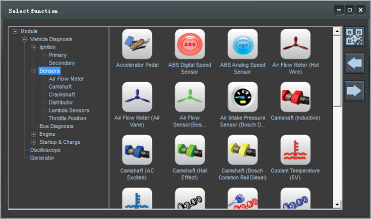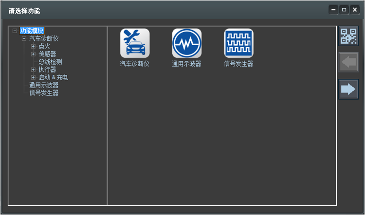 包含汽车诊断仪、通用示波器、信号发生器三种功能,其中汽车诊断仪包含78中汽车测试功能。